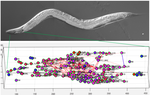 本研究では、神経結合ネットワークが解明されている線虫C.エレガンスを用い、立体観測用の顕微鏡で頭部の全神経細胞の活動を、時間を追って測定します(4Dイメージング)。測定した結果を計算機上のニューラルネットワークモデルで学習させることにより、神経活動を予測するモデルを作製します。ニューラルネットワークの構造と予測性能の関係をさまざまな側面から検討します。さらに、実際の神経結合ネットワークを模したニューラルネットワークを作製することにより、実際の生物が持つ神経回路の構造がいかに最適化されているかを理解します。